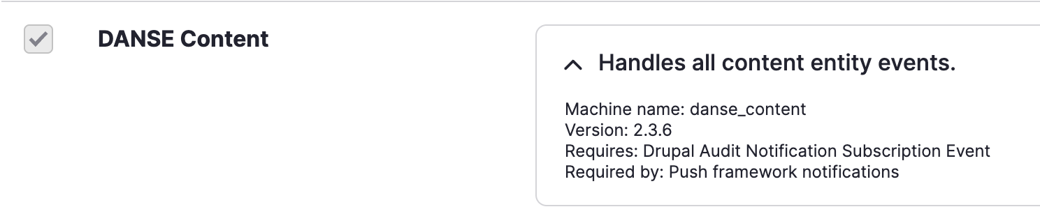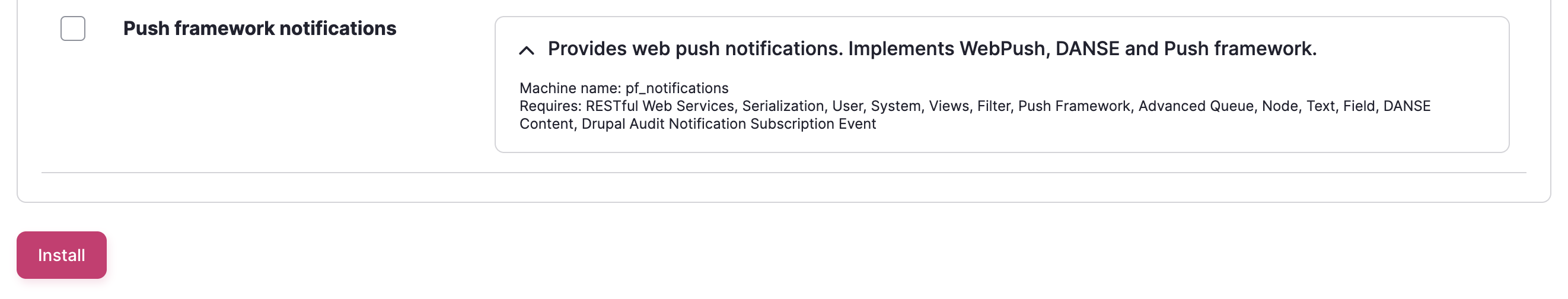 As you can see, the module has many dependencies that will also be installed. The two direct dependencies for Push Framework Notifications are DANSE and Push Framework.