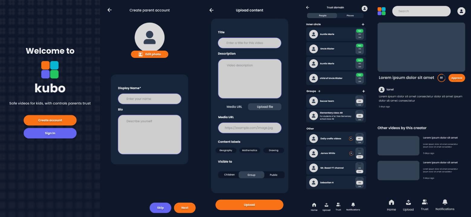 Within this initiative, I’ve taken on the responsibility to build a demo - https://kubo.watch. The goal of the demo is to prove that you can exercise full parental agency over what your children can do, based on trust. The demo focuses on video content, just like YouTube Kids. Here are some visual mockups of the demo.