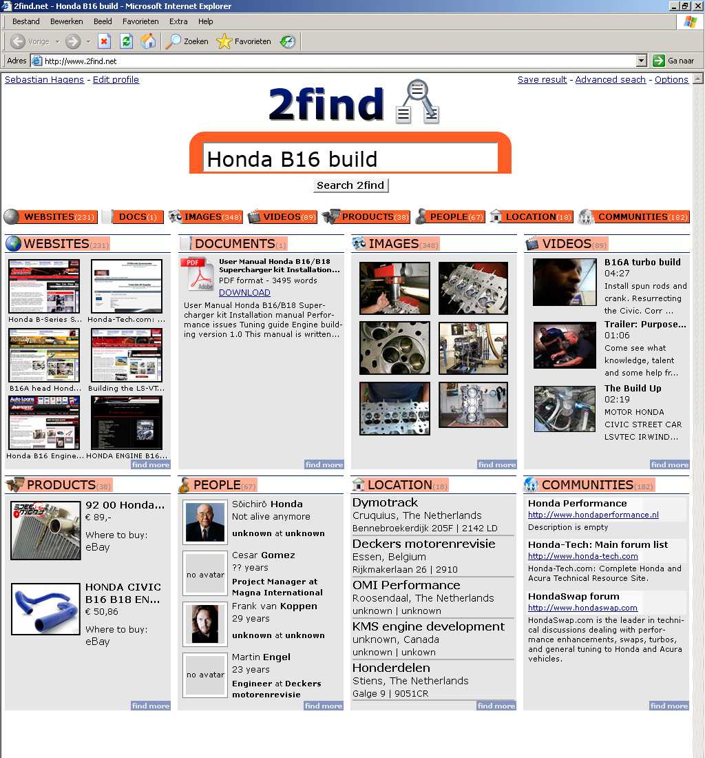Als ik ga zoeken naar Japan krijg ik ongeveer dezelfde resultaten terug, echter zal ik bij video’s, products etc ook auto-gerelateerde resultaten terug krijgen. Waarom? Omdat 2find weet dat ik ook een grote interesse heb in Japanse automerken. Hieronder staan enkele beeldimpressies hoe het platform eruit zou kunnen gaan zien.